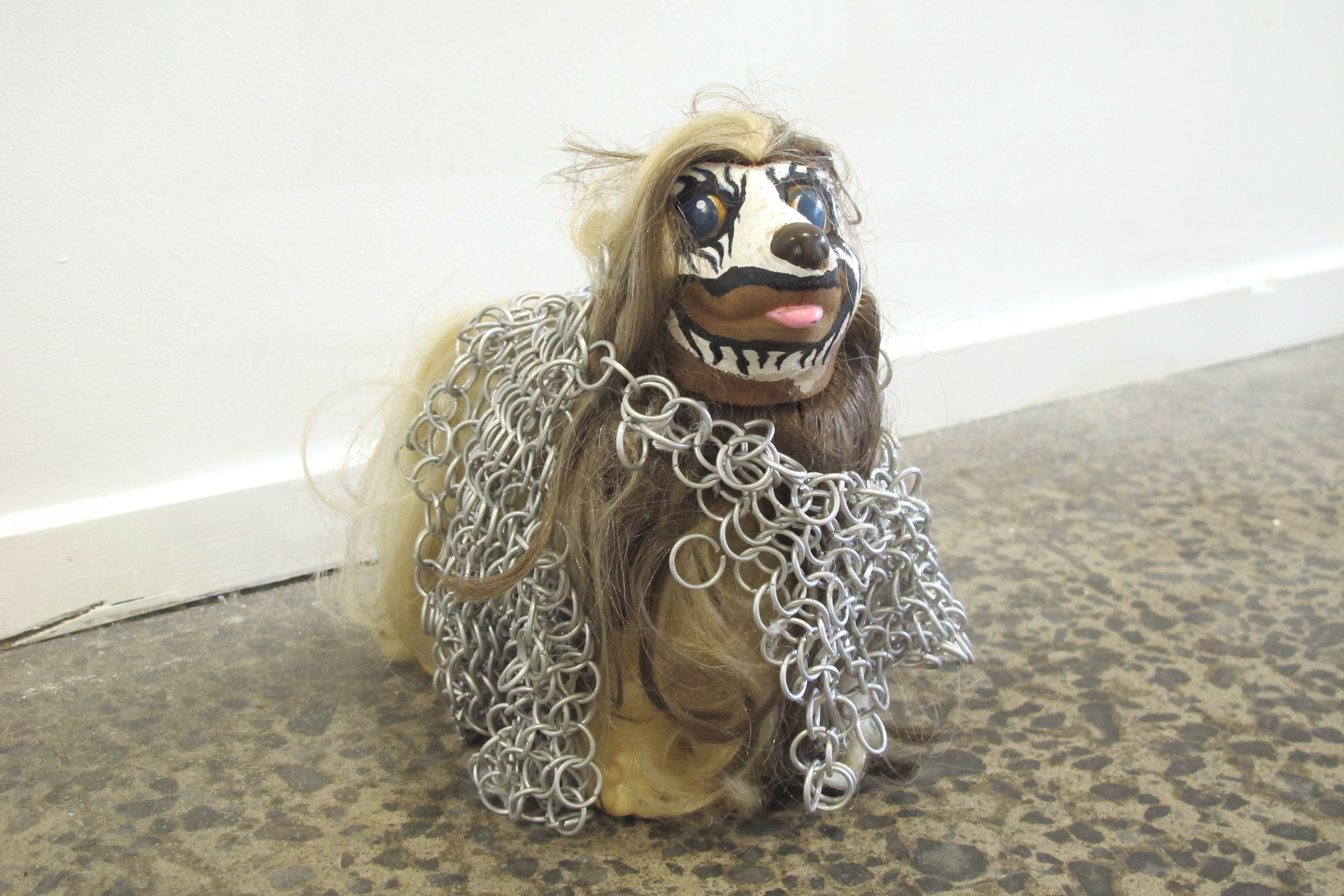 William Wallace 2023, chainmail, paint & wig on dog figurine.